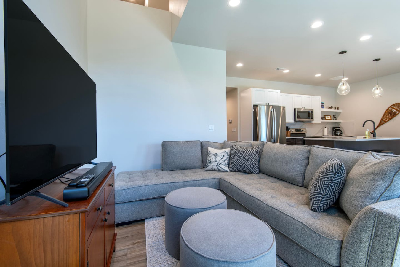 This new spacious townhouse has an open concept main floor with a living room, designated dining room, kitchen with top-of-the-line appliances. There are spacious storage closets on the main floor as well as a main floor half bathroom. Stay warm this winter with the 2-car attached garage with two shoe drying units (up to four pairs of shoes at once). Hang out in the open-concept living room which offers plenty of space to relax, play games or watch TV. You will also find a patio with outdoor seating on the main floor. Upstairs you will find three (3) bedrooms that all have views of mountains from the bedroom windows! Bedroom one is the primary suite with a king bed and is situated away from the other two bedrooms with an en-suite bathroom and walk in closet. The master suite also has a smart TV. Down the hallway you will find an additional full bathroom along with the second bedroom with a queen bed and the third bedroom with two (2) twin beds. You will also find desks in the queen and twin bedrooms. Cleaning your gear is easily accessible with a full-sized washer/dryer. Comfortable and inviting local artwork throughout the living areas complete this cozy space, perfect for entertaining your group. This townhome provides amenities to make your vacation easy, convenient, and unforgettable. We understand that plans may change, which is why we offer a full refund of bookings canceled at least 14 days before the start of the reservation. For stays of 29 nights or more, an additional insurance fee will apply. Driving times to attractions: — walking distance to main part of Driggs (restaurants, grocery, bars, coffee, ice cream) — Teton creek access points 5-15 min — three public golf courses within 15 min — Grand Targhee 25 min — Jackson hole 45 min — Jackson downtown 45 min — Henry’s fork / South fork snake river 60 min — Jackson airport 60 min — Idaho falls airport 75 min — grand Teton national park 75 min — Yellowstone National Park (west entrance) 100 min